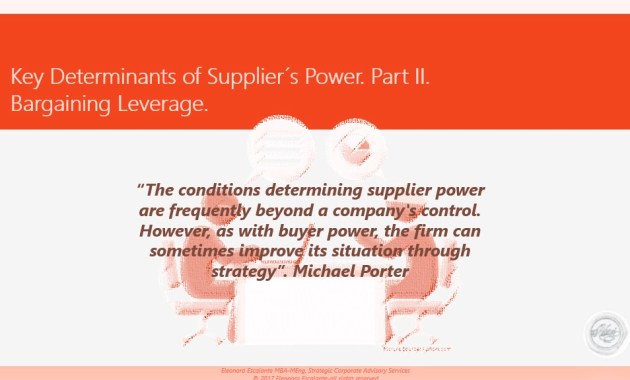 Leg Zero: The Bargaining Power of Suppliers. Porter´s Industry Analysis. Part 2. Dear all: Find attached my set of slides about the Bargaining Power of Suppliers. These key determinant factors are likely to be important in determining the bargaining power of suppliers […] eleonoraescalantestrategy 6 Oct 2017 Leave a Comment