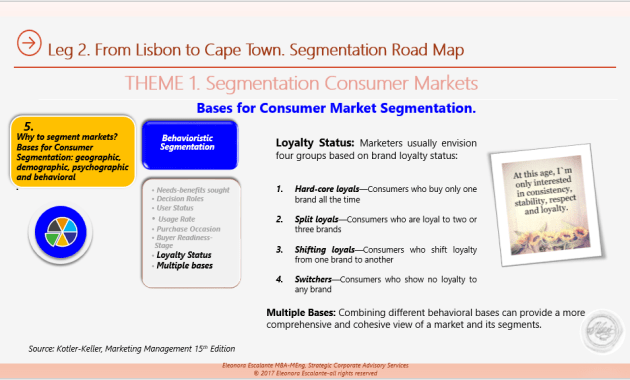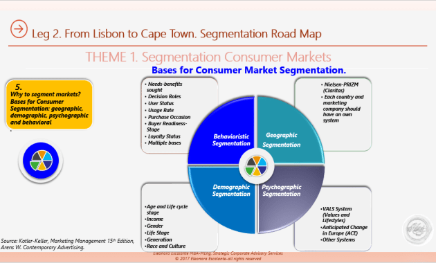 Leg 2 from Lisbon to Cape Town. Theme 1: Segmentation Consumer Markets. Part 7. Hello!!! We will continue today with the topic I promised from yesterday. Let´s start because we have a lot to cover today. Bases for segmentation and the 4 main categories to […] eleonoraescalantestrategy 14 Nov 2017 Leave a Comment