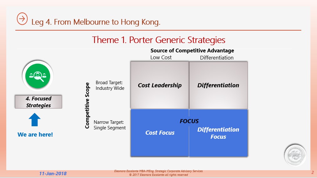 Usually, focus strategies are scenarios chosen by international companies to “test” their business models within specific groups. But if we are not a multinational corporation, depending on your product or service, it is still key to decide whether if we will pursue a Focused Cost Leadership or a Focused Differentiation.