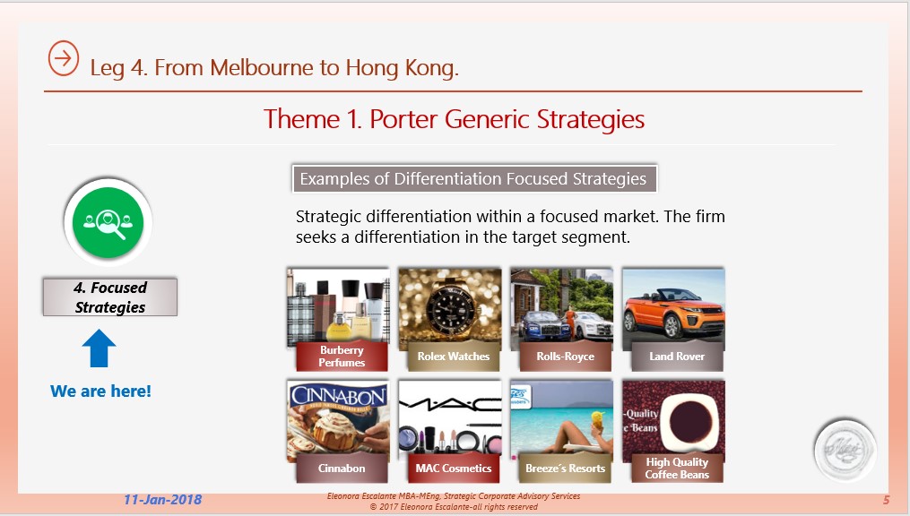 A Focus strategy needs to be accompanied by a “value added feature”. That “extra-mile” or “something extra” is easy to identify in “focused strategies” because you understand that market very well, and because of your deep understanding of customers’ needs, is perfectly easy to increase differentiation. As a consequence of serving that market niche, you will differentiate and be unique.