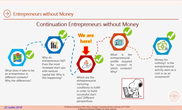 Entrepreneurs without Money (XXXV): Summary and conclusions. Entrepreneurs without money started on July 4th, the day for remembrance of the United States Independence. We started to write with the idea of nourishing us in relation to the […] eleonoraescalantestrategy 30 Oct 2018 Leave a Comment