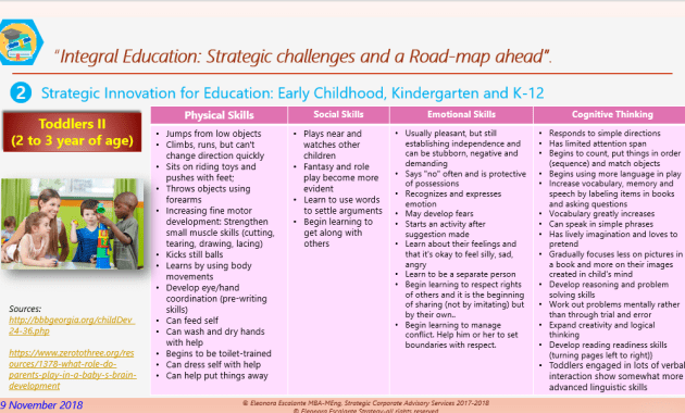 Integral Education: Strategic Challenges & Road-Map ahead (VII). Strategic Innovation in Education – Toddlers (Part C). Today is the turn of Toddlers 2. We have defined Toddlers 2 as those who are between 24 months (2 years) to 36 months (3 years). The whole idea about […] eleonoraescalantestrategy 19 Nov 2018 Leave a Comment