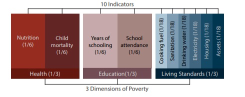 The Multidimensional Poverty indicators include the following variables. Source: https://ophi.org.uk/multidimensional-poverty-index/databank/global-comparisons/
