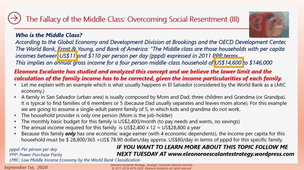 For the time being, what I wish you to keep in mind is the social stratification definitions can´t be conceived as a demographic income “individual ratio” for the next generations’ perceptions. There are other ways to define the Middle -Class using demographic indicators, and particularly in terms of a family household income indicator, considering that demographics change over time, the number of job-holders per family, and the retirees who typically do not generate income. In many developing countries retirees can´t live from their pension funds savings, but they depend on their adults working children.