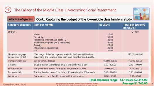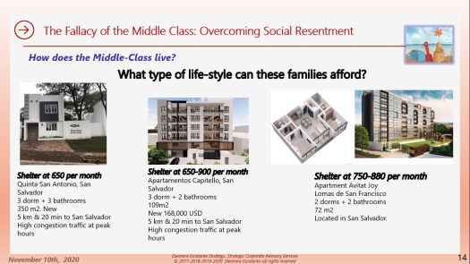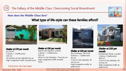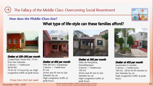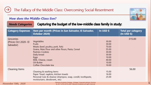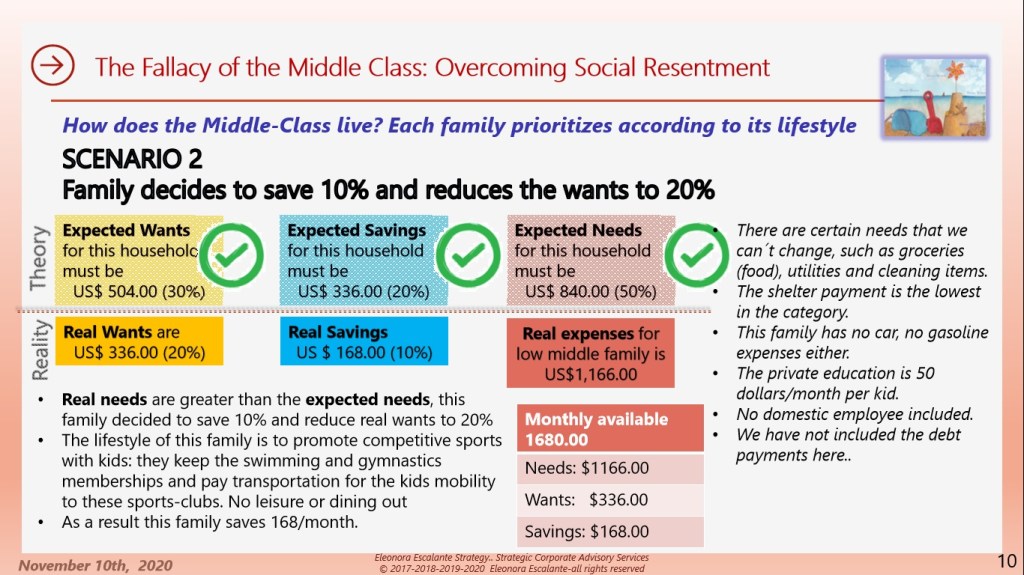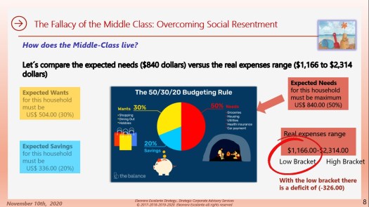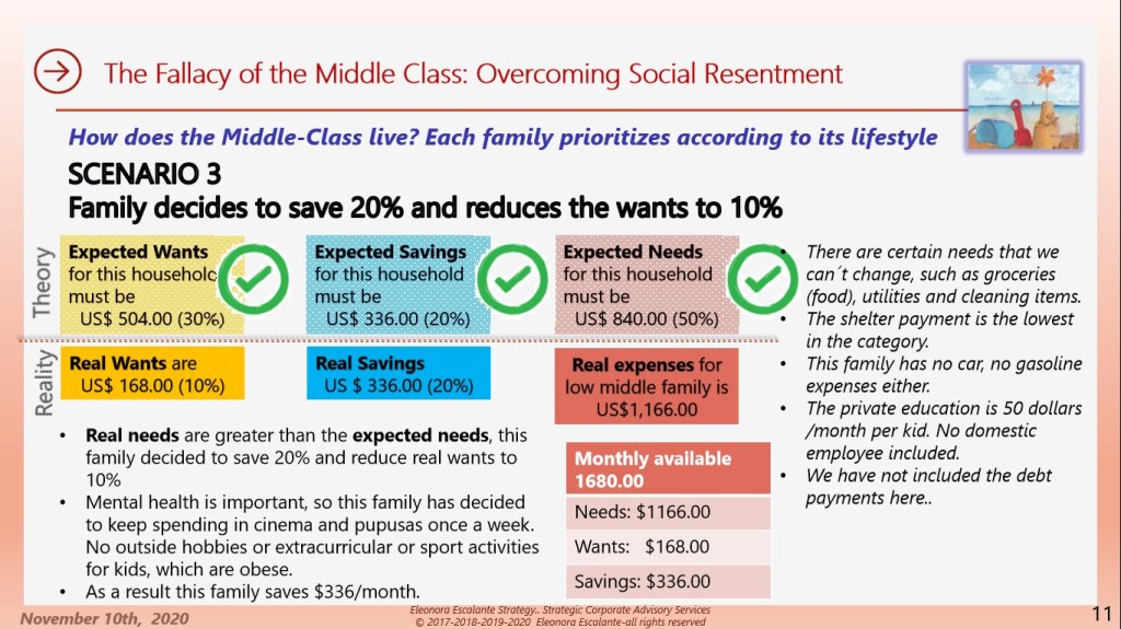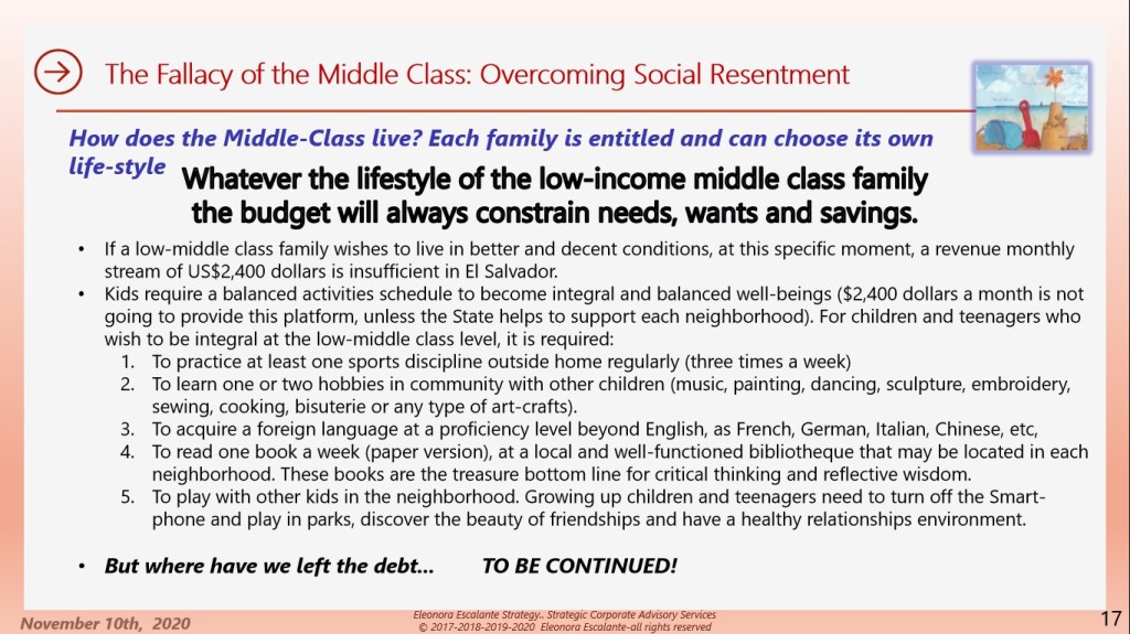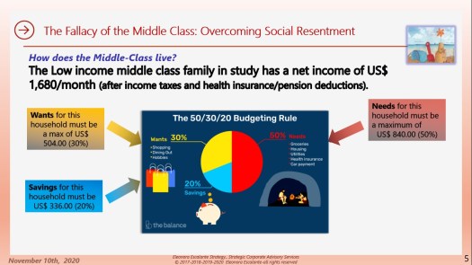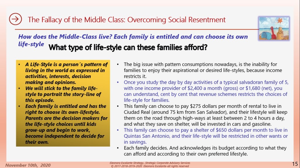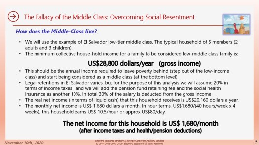 Today´s topic is about How the Middle-Class live? In particular, I will explain with the Salvadoran low-middle class family composed of 5 members, in which only one adult is the economic provider. This family lives as a typical Low Middle-Class one in town, with US$2,400 dollars per month (gross), or US$1,680 dollars per month (net) after income taxes, public health insurance, and pension retentions. I picked up this example because the annual gross income for this household (US$28,800) coincides with the median low-income class in the United States.