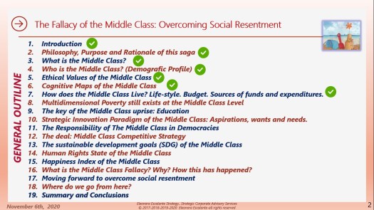 For the time being, it is realistic to think that we have inherited a cognitive map, a very straightforward route, of givens-means-ends, which are a graphic representation that provides a frame of reference for the Middle-class to do what they do during their lifetime. Please acknowledge that all the givens, means and ends, that I explained to you last week are of “popular knowledge”. I probably do not agree with some of them, but I have tried to respect what my middle-class peers consider or assume when they see themselves as middle-class citizens. Eleonora Escalante Strategy reflections will come later, once I finish to set up the table of learning for you.