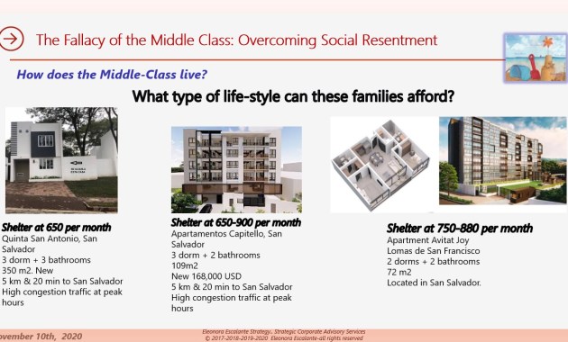 The Fallacy of the Middle-Class: Overcoming Social Resentment (XII). International Cooperation can help to overcome multidimensional poverty. Have a beautiful tuesday. Today, we will continue exposing the truth about the real life of the Middle-Class, regardless if we live in El Salvador, or Switzerland, or Peru, or […] eleonoraescalantestrategy 17 Nov 2020 Leave a Comment