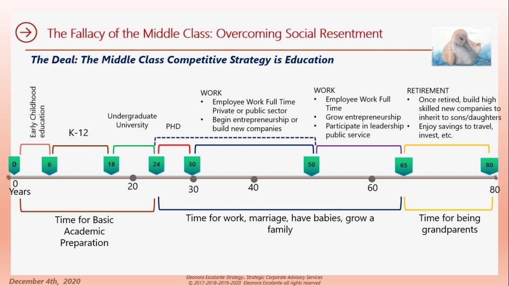 Now let´s explore ideally how does the society timeline should work to promote high-skills education for the benefit of social mobility (please this is an abstraction of the reality). Each person is free to choose the path of their life according to their own priorities or vision of how they perceive they can make a living, but this is what happens (usually) when we choose education as a key differentiation factor to belong to the Middle-Class: