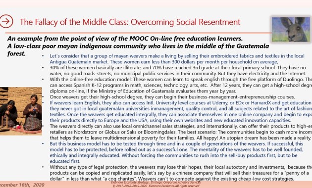 The Fallacy of the Middle-Class: Overcoming Social Resentment (XXII). MOOC online learning can trigger social inequality? Have a beautiful friday. We are almost done with this saga. Next week we will basically finish with topics 16, 17 and 18 of our outline, leaving the last subject […] eleonoraescalantestrategy 18 Dec 2020 1 Comment