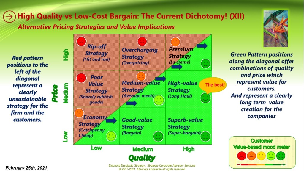 The Superb-Value Scenario makes our clients happy, but not the firms. Yesterday, I left the Superb Value Scenario of the nine-pricing scenarios matrix as the last one to explain. This pricing position is the one located at the bottom corner at your right. Can you see the happy green face there? Well, this happy face corresponds to the mood of happiness of clients when they get AMAZING quality at ultra-low prices. So many firms could be tempted to believe that this is the way to go. Particularly those who only see the relation between Price and Volume of goods sold. And the reason why the whole world is moving towards low-cost strategies is certainly based only on a calculation of price x volume. But not in a value-based perspective.