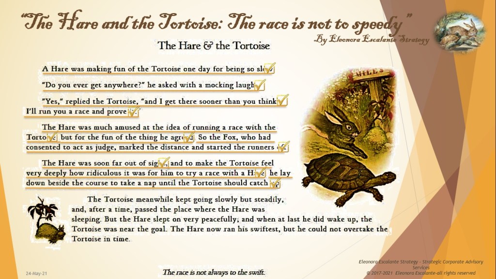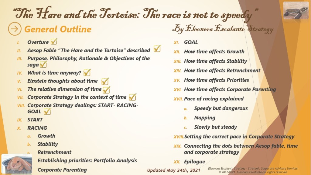 The Hare and the Tortoise: The race is not to speedy (XII). Corporate Strategy Dealings: Start-Racing-Goal