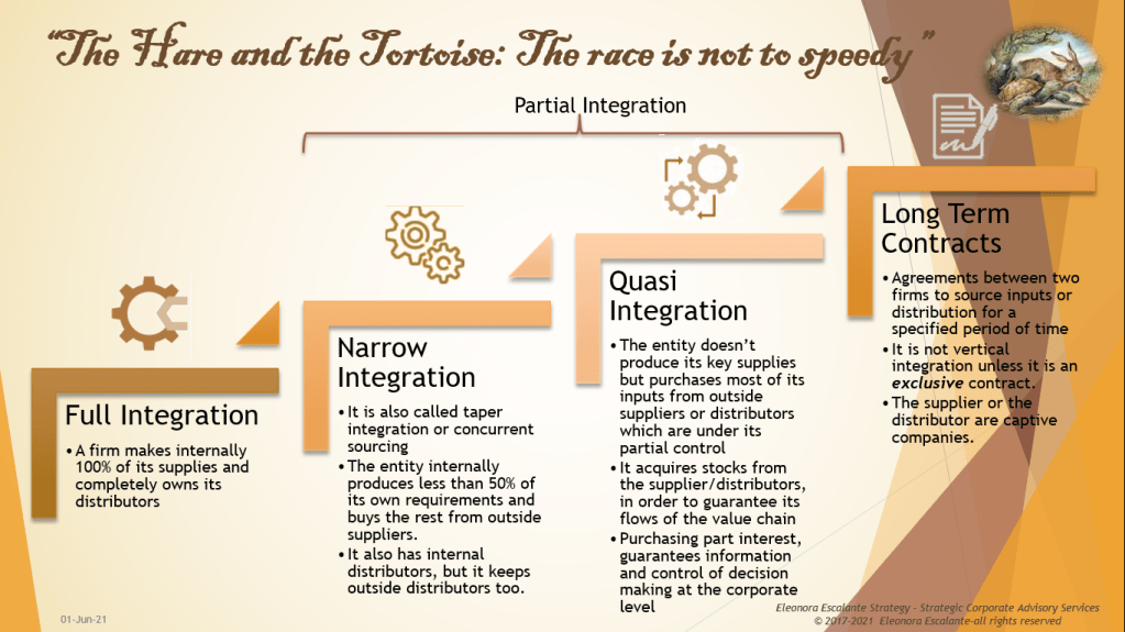 Vertical Integration seems to be logical for those entities with a strong competitive position in a highly attractive industry, particularly in the technological sector, where it is important to keep the secrets of the whole value chain in the same ownership. But there are some cases or specific industries, in which it is not feasible to do it because of transaction cost economics.