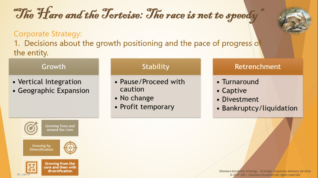 Growing, Stability, and Retrenchment. Some corporate strategy authors have coined different terms when it comes to teaching corporate strategy. Probably you will read the term corporate directional strategies, or a corporation directional strategy or you will see vertical integration/geographic expansion per separate subjects, as building blocks. But for us, since the corporate strategy is about decision-making at the top, we have to be congruent, and we baptized the corporate strategy formulation as a decision-making formulation. And, corporate strategy pre-establishes a previous roadmap design, measured in terms of time. That is why we will stick to the term “path” or “route”. You will comprehend why we have named, what other authors call “strategies”, to “paths”. In a couple of weeks, you will find out, when we end landing into the strategic reflection critique of the current theory. Be patient, we will arrive there, and we will also use examples, as you are used to reading from us.