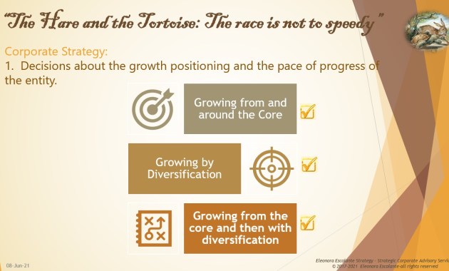 The Hare and the Tortoise: The race is not to speedy (XVI). Growing from the core and then with diversification … “The tortoise meanwhile kept going slowly but steadily”… The hare and the tortoise, a fable by Aesop Today we will continue with the subject number three about growing paths […] eleonoraescalantestrategy 8 Jun 2021 Leave a Comment