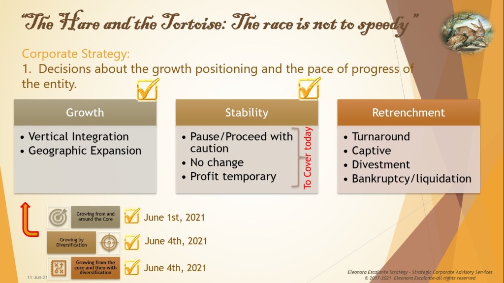 This decision is equivalent to the “time-out”. It is stability at its core. It is defined by strategists as an opportunity to take a break for nurturing and establishing poise, a sense of balance after a chaotic growth. It is also defined as a deliberate attempt to make only incremental improvements until a particular external situation change.