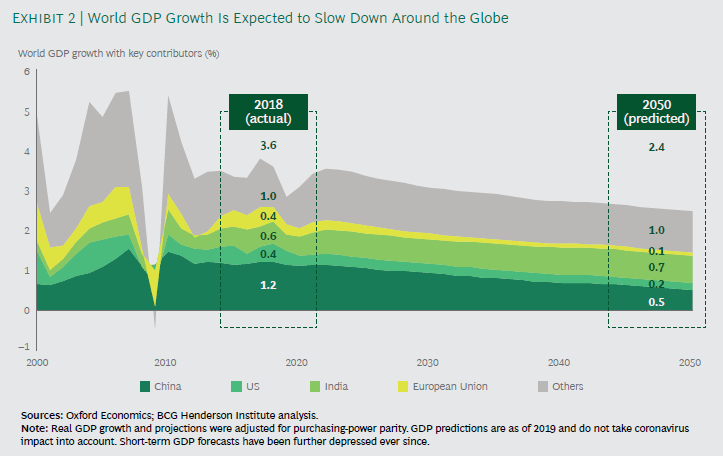 A pause/proceed with caution is the route usually conceived as a temporary “rite of passage”, in which all the players of an industry or a whole economic system is fixed, or the industry becomes more hospitable by changing the rules of the game, or to enable a company to hold steady its resources after prolonged rapid growth. For example, according to BCG Henderson during the last two decades, the growth reached after the year 2000 has been erratic and unstable. The next graph (which doesn´t take into consideration the impact of the Coronavirus pandemic) tells us a lot to consider at the moment.