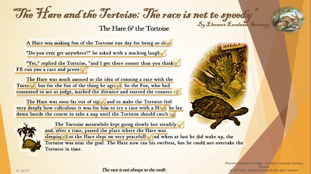 I will stop here. Our next publication will be “Connecting the dots between Aesop fable, time and corporate strategy”. Remember we will end this saga in a week from now, next Friday, 23rd of July 2021. Then we will splash into our 2 weeks’ vacation, just to return back on August 10th for the inauguration of the third saga of 2021: “Portfolio Analysis: Igniting long term spirit into a short-term world”.
