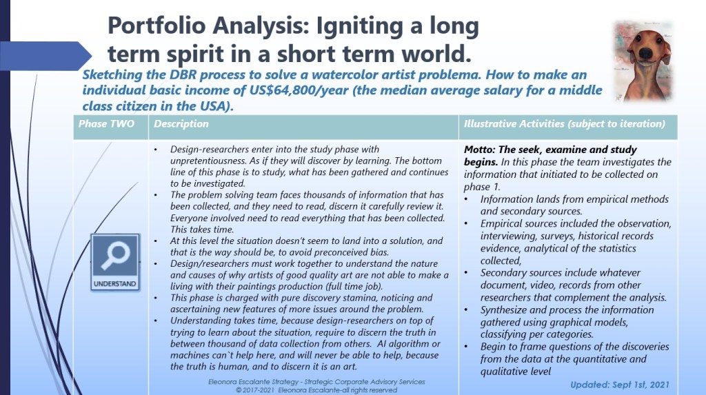 After we focus on our project, we open the tollgate again and proceed with phase number 2. UNDERSTAND. In this phase, design/researchers are committed to the study. Yep! We need to study, not just read what we began to gather on phase number one FOCUS. But to study as if we are in the University. This means not just to ask ourselves a lot of questions (as I have taught you when we use strategy innovation frameworks), but to investigate all the information that we began to gather in the FOCUS first phase. In this step, we simply put our cap of a studious learner. Let´s see it below in slide 2.