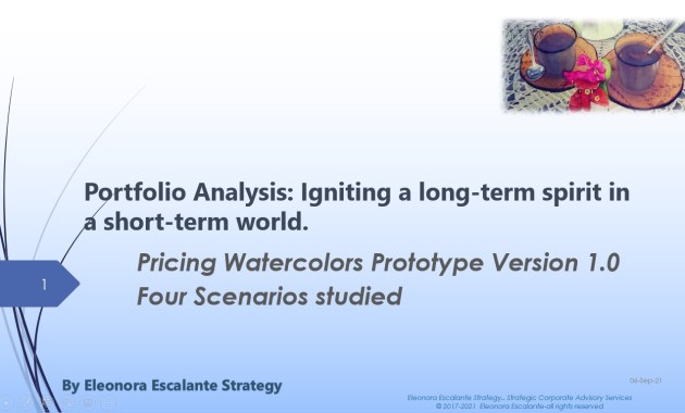 Portfolio Analysis: Igniting a long-term spirit in a short-term world (IX). Our sub-prototype for Pricing Watercolors Version 1.0 Have a wonderful first week of September. If climate change were not so evident, we should be celebrating the beginning of Autumn. But the global warming effects are now so […] eleonoraescalantestrategy 6 Sep 2021 1 Comment