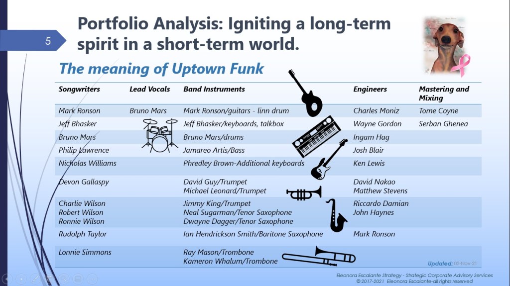 Why did we choose Mars & Ronson’s “Uptown Funk” composition last week? If you click the original official video at 3:27 minutes, the whole experience of watching the screenplay is shifted to the band. The protagonist is not the singer Bruno Mars anymore, but the instruments played by the rest of the band members. The power of watching them playing each individual instrument (the bass, the trombones, the saxophones, the keyboards, the drums, the electric guitar, the electric bass, and the trumpets, altogether) is still hilariously remarkable and energetically powerful, so well-conceived, and performed by the band players. Regardless of the many awards, the Grammy, the millions of streams, and the number of copies sold; “Uptown Funk” sticky mix of rhythms is still so popular, to a point that it is the top longest-running Billboard Hot 100 song of the past 2010´s decade (5).