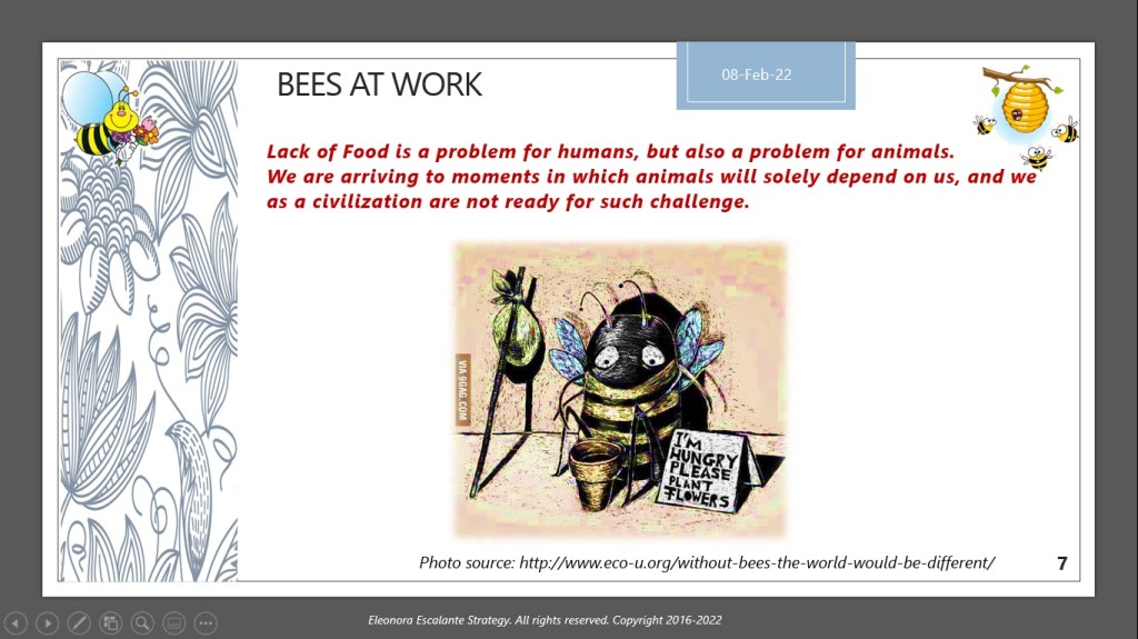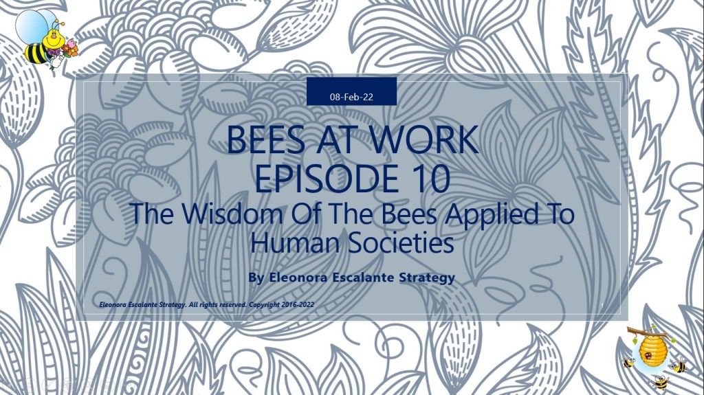 Eleonora Escalante Strategy was touched by the honeybees’ story, not only because it is fascinating to witness and learn how the investigation and detailed observation unfolds the beauty of the unknown; but also because Seeley´s experiments demonstrate how vital is to understand first. Studying first is crucial. To learn from each and all of the species on the planet, in order to accomplish our role as administrators and caregivers of it. Each community of species has its own nature, its own challenges to survive in the context of climate change struggles and obstacles. Nothing that we do in our society is isolated from other species populations. No matter what group you can think of in the fauna or flora, it could be insects (as the bees or wasps), or whales, or elephants, or jaguars, or hippos, or giraffes, or lions… all animals (and plants) have been crushed by the consequences of our lack of vision when manufacturing and selling our products/services. The pollution and contamination are not reduced to the utilization of oil and gas for our transportation requirements; it is about pesticides; it is about the approval and financing of wrong-business models; it is about accepting algorithms of artificial intelligence instead of human wisdom; it is about excessive greed with communication technologies infrastructure in the space and on earth, and it is about lack of understanding. We are reaping off the consequences of our ignorance.