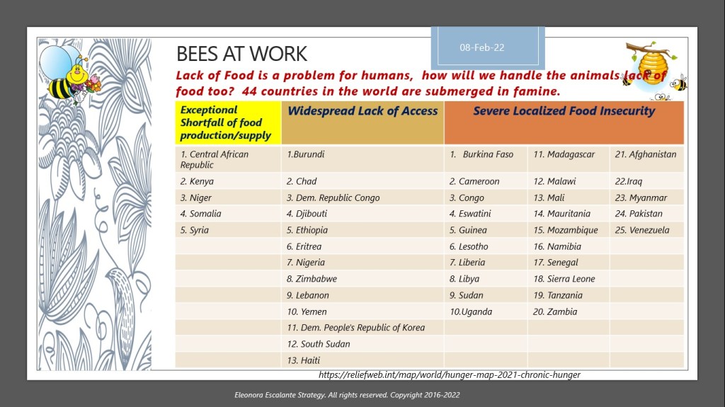 The fauna and the flora are interconnected. There aren´t enough pure (pure understood as free of pathogens, free of pesticides, free of diseases) countryside flowers to keep honeybees alive. The same happens with us. I dare to affirm, that our flora is so sick, that is affecting human health. The same happens with the bees. And when we learn and understand these facts, that is the breakthrough for corrective actions. Only when we learn to recognize it is when we can overcome our ignorance and unconsciousness. Just to realize that what bees eat, breathe or drink is killing them is enough reason to wake up. Just to discern that the Internet radiations and wave frequencies are affecting the senses of bees when they do forage or house-hunting; that is enough reason to rethink the premises of the Internet in our civilization. Until these past recent decades (the 1980s), animals always had their own collection routines for food & subsistence, and they organized their living, migrations, and reproduction gatherings to accomplish the cycles of their feedstuff alone, without any of our input and help. Nowadays, more and more, animals are starving. Animals are sick because they have no food, they have diseases, or eat adulterated or fouled inputs. The bees are suffering because of a deficiency of healthy queens. Because there are queen issues of poor performance reproduction that are leading to the loss of honey bee colonies too. Their foraging activities do not provide enough, and if they find supply, this provision is limited, polluted, nauseous, and poisoned with pesticides, plastics, or with the new viruses, bacteria, fungus, etc.