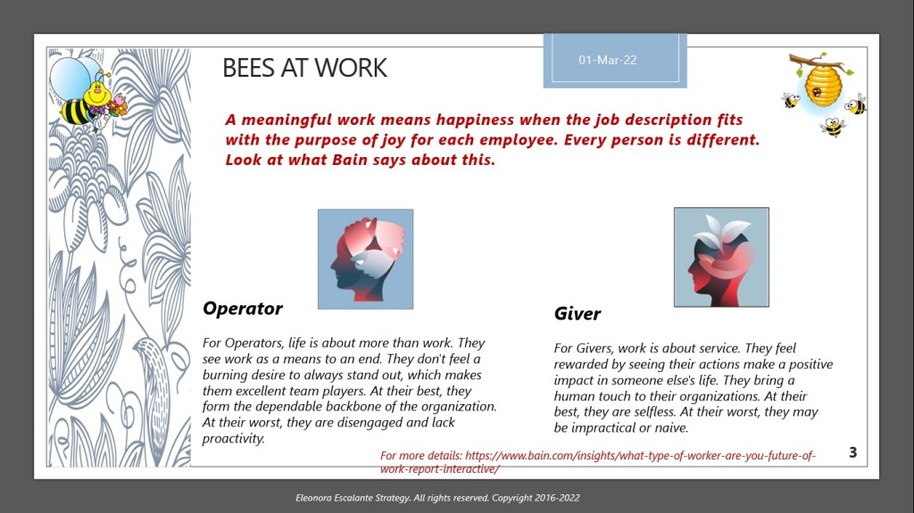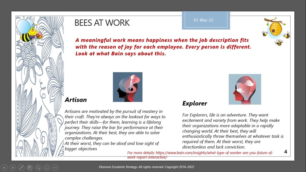 Sometimes the lack of happiness at the office is not defective on the employer. It may happen that the employee has been hired in a role for which his or her archetype doesn´t fit with the employer’s team expectations, and/or the manager is not trained to help the employee find happiness either. Let´s see what Bain & Co has produced when it comes to general archetypes of jobs (1):