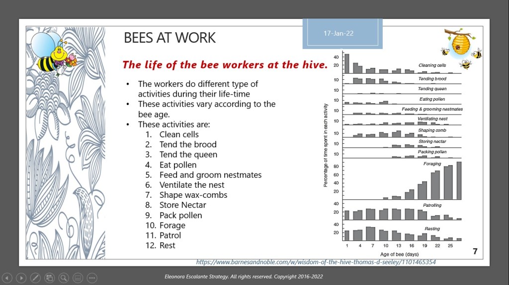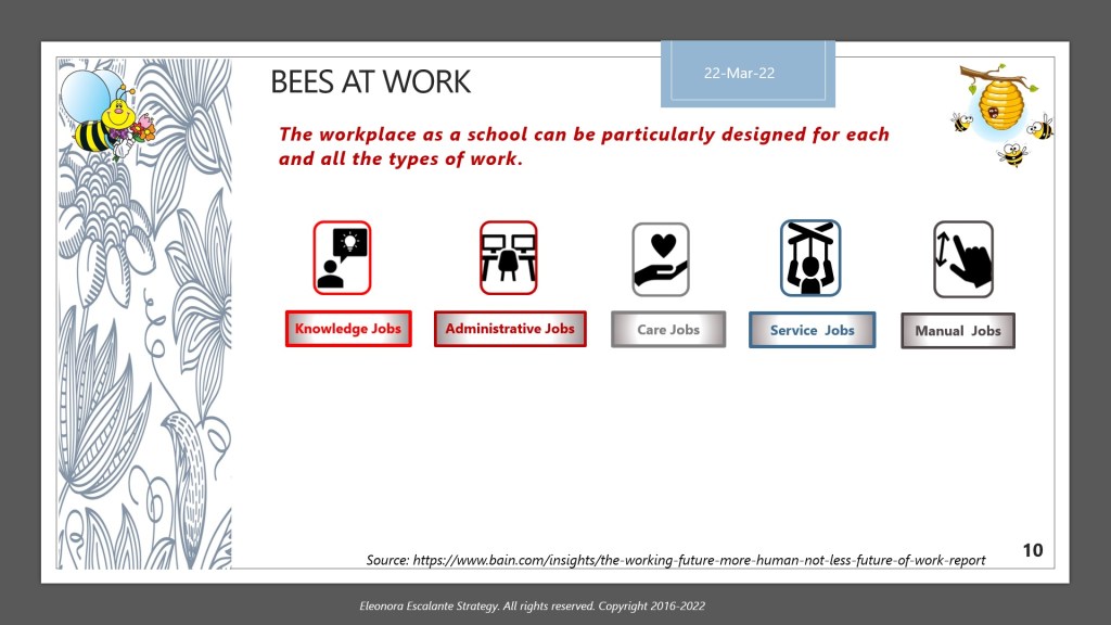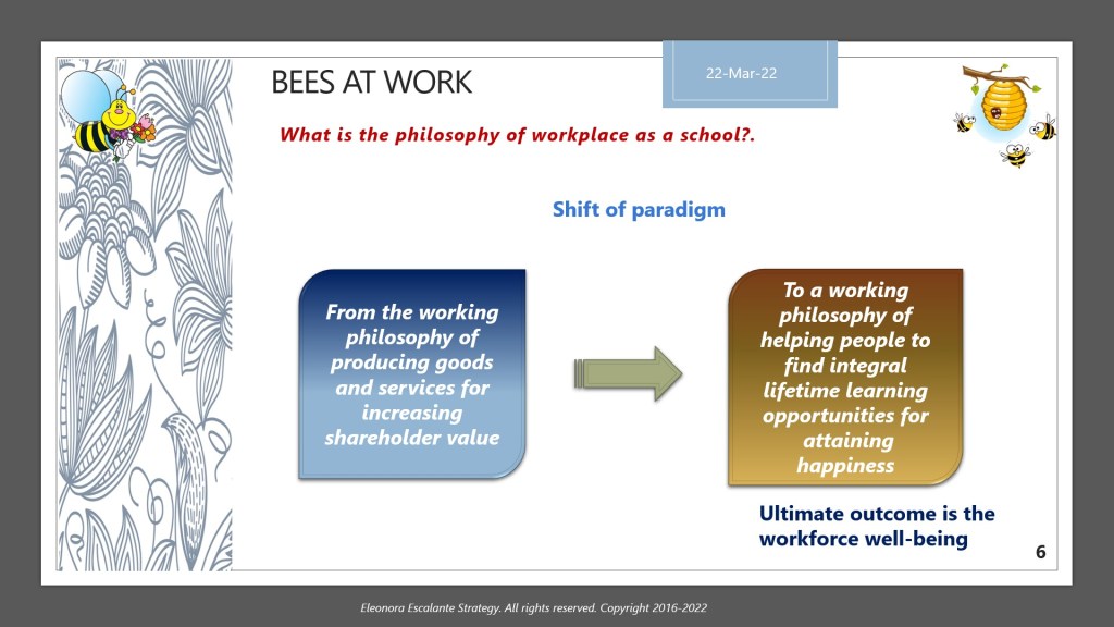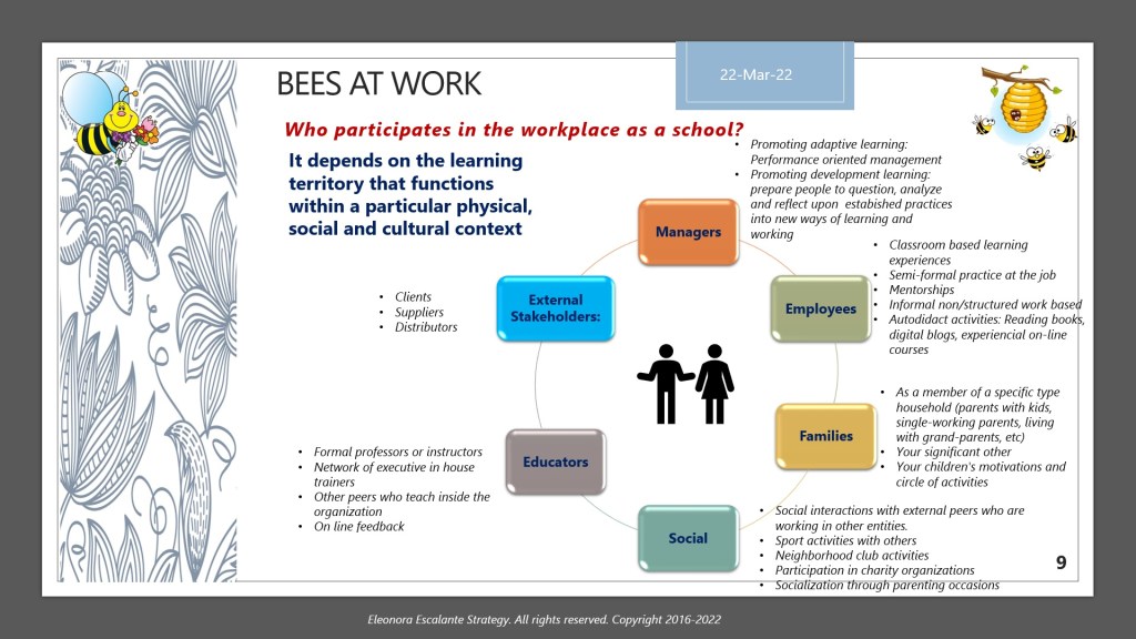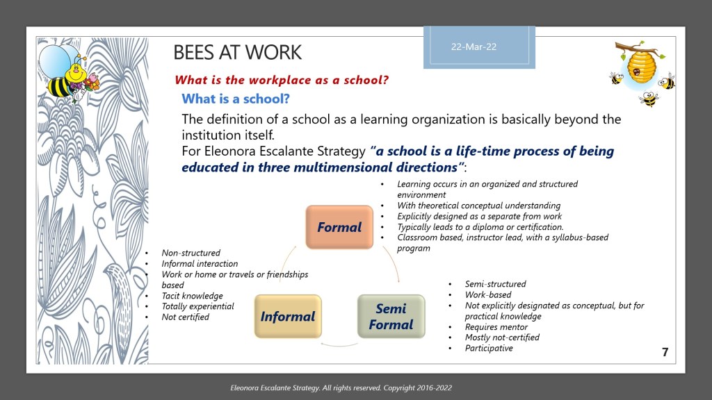 Have a beautiful beginning to this week. For the learning of this subject, we will publish two times, Part A and Part B. Today I will show you only the material of the slides that we will utilize to explain why the workplace as a school is the best option for human beings. Regardless of the type of occupation, or the industry to which any of us belong, considering the workplace as a learning organization is what bees have done since its birth.