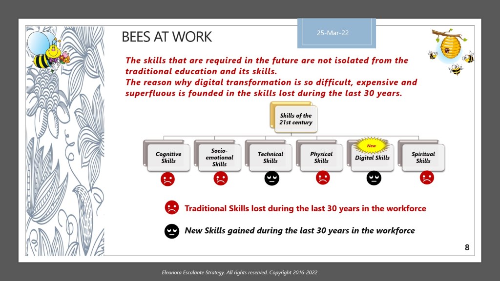 Have a beautiful last Friday of March 2022! Today´s subject is “Skills of the halted workforce and consequences of losing them”. This topic is in the context of a remote performance, experienced by many during the pandemic of COVID-19. In addition, we will explore what has happened during the last 30 years, once the Internet began its immersion power into our life, and little by little started to be ubiquitous for everyone. We will be direct to the point on what we are losing with the utilization of the NAIQIs, and what will happen to the workforce in the middle of an obligatory spiral of technology innovation, led by artificial intelligence, data analytics, and machine learning.