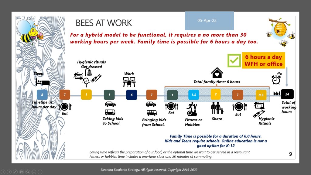 Eureka!. If we work on the same schedule as our kids. We continued polishing our idea of 6 working hours a day (no matter if WFH or working in the office), adapting our schedules around approximately the same 6 hours that our kids spend in school. Also, we switched our fitness time for later, after picking up kids at school, and we propose that fitness or exercise workouts can be shared by the family (whenever is possible). And look what has happened: We can attain 6 hours of family time too!