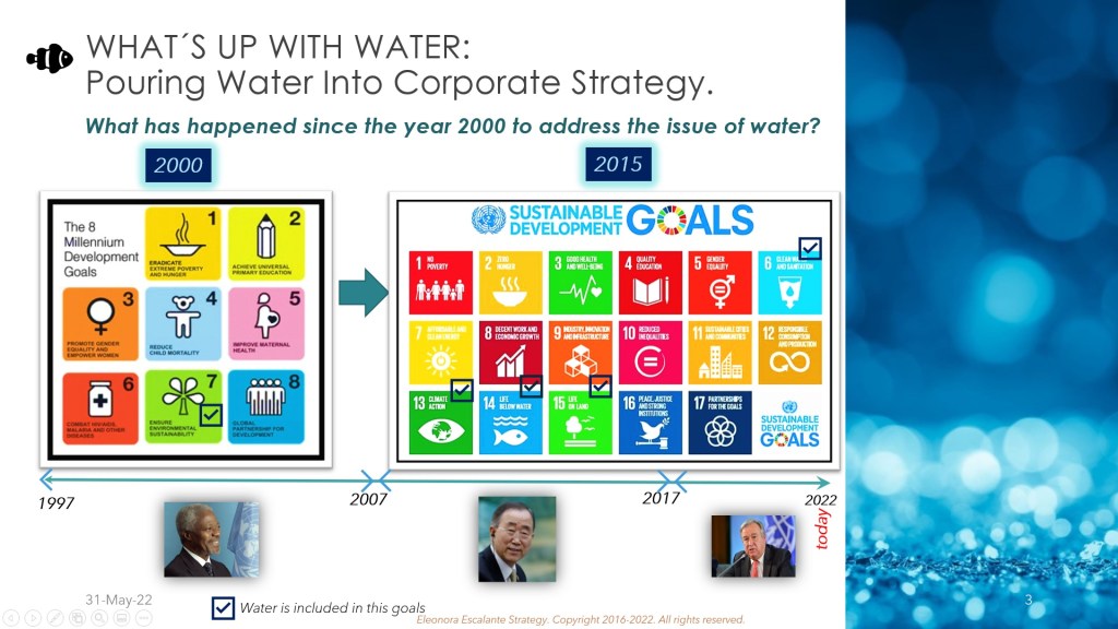 In reality, these types of attainments take at least 100 years. After the MA findings were released in 2005, Annan passed the power baton to a new United Nations leader, the South Korean Ban Ki Moon. Under Ban Ki Moon, the United Nations was working back and forth on an upgraded development framework of priorities. As a result, the Sustainable Development Goals (SDGs) superseded the MDGs as of 2015. We have covered in several opportunities the Sustainable Development Goals (SDGs) on this website. Water and Sanitation is one of the 17 objectives set forth by the United Nations to define the global development agenda priorities for the next 15 years until 2030. Look at slide number 3 in the presentation above.