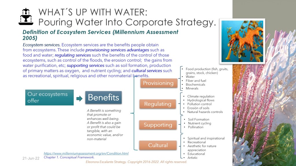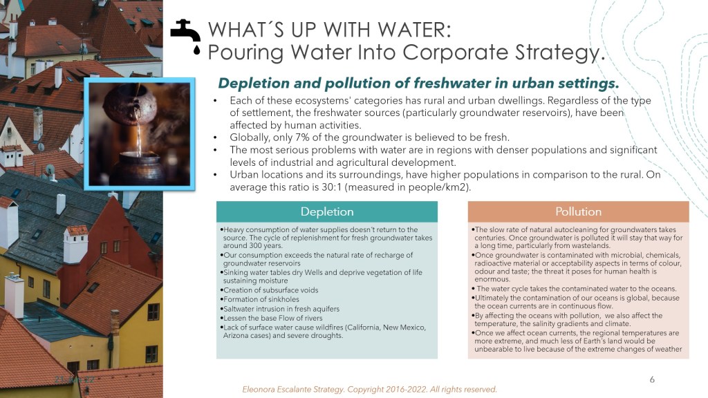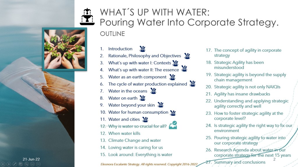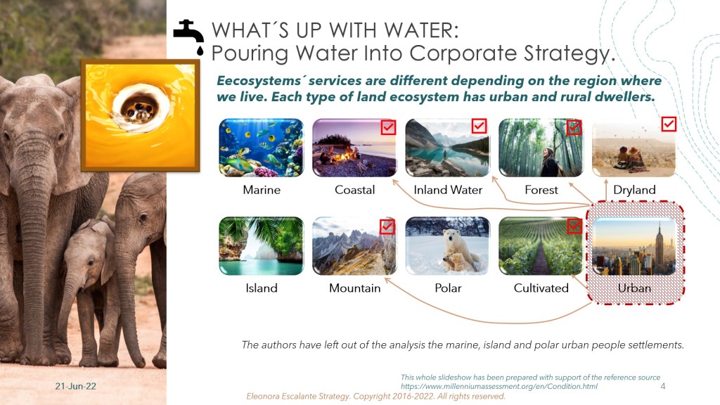 Have a beautiful rainy solstice day in June for those who live in the tropics. For those who are experiencing the beginning of the elevated summer solstice temperatures, please acknowledge that every sweating of yours is evidence of your inner perspiration cycle, a thermostat sign of how humans have been affecting the water cycle with our endeavors. Before proceeding further, we have an assignment for you: Please read chapter number 27 “Urban Systems” of the report that you find in this URL: https://www.millenniumassessment.org/en/Condition.html . We encourage you to download it, and read its 31 pages, as part of your reading lifestyle for this week. The information of this assessment is not out of date. Humans have not changed this situation during the last 20 years, on the contrary, Eleonora Escalante Strategy believes the situation of our water status is worst nowadays. Why? Because we have depleted and polluted our world during all these years. Therefore, this reading assignment will set your brains for our strategic reflection of today.