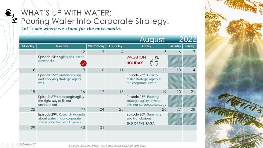See you next Tuesday 9th, with the 25th episode of “What´s up with water: Pouring water in your corporate strategy: Understanding and applying strategic agility well”. For the Salvadorans who are reading me, we wish you a fantastic vacation time, please always be safe. Thank you for reading to me.