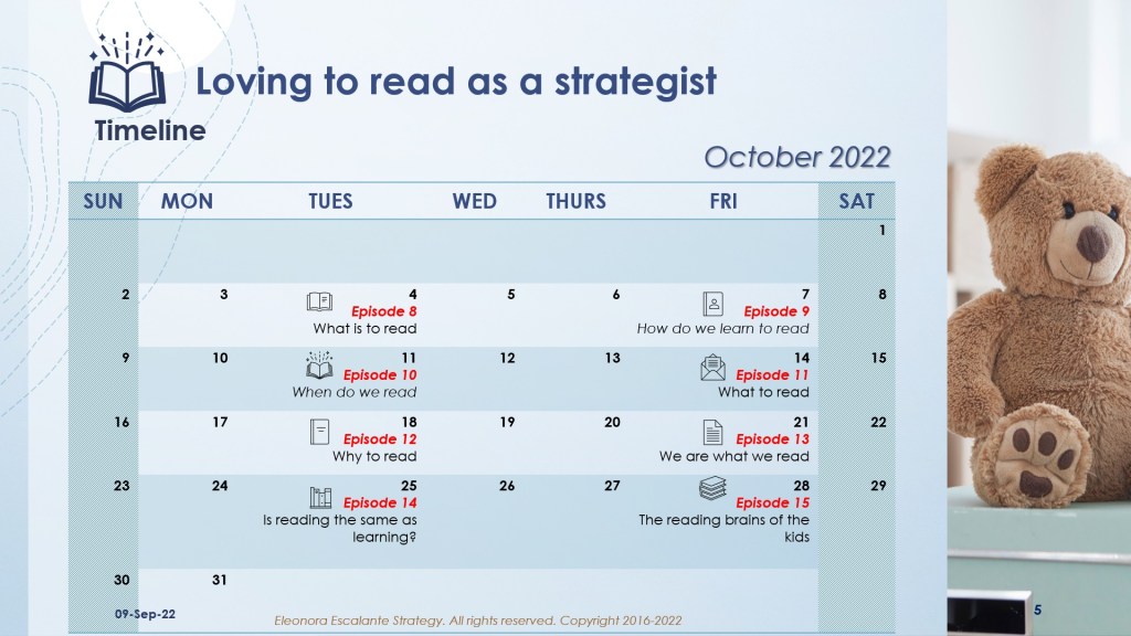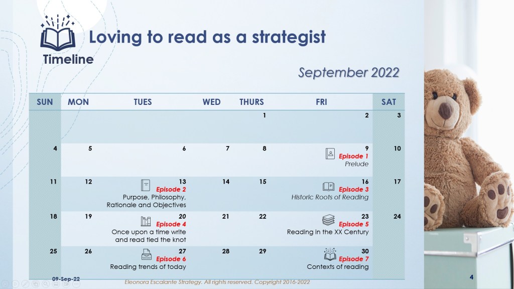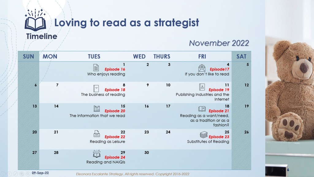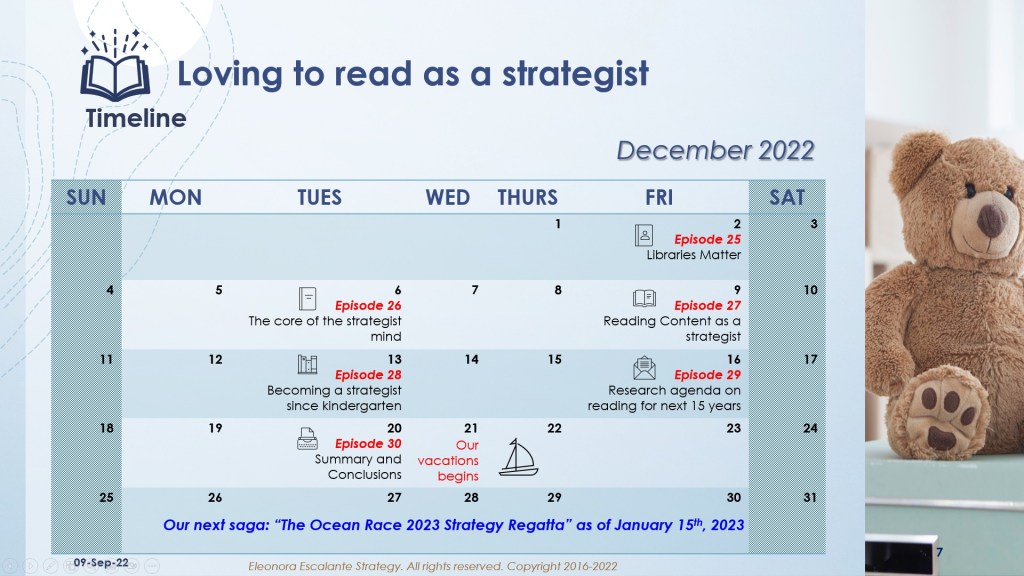 The outline of “Loving to read as a strategist”. We have prepared our timeline for each week up to December 20th, 2022. This time we have tried to provide a calendar for our saga´s publications. Look at them below. If you wish you can print the document in PDF too. The content of our Autumn-Winter production is in the presentation slides.