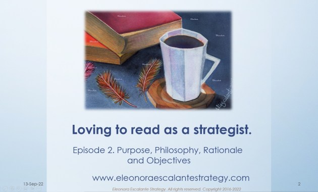 “Loving to read as a strategist”. Episode 2. Purpose, Philosophy, Rationale, and Objectives. Wishing you a charming month of September. Probably you already know (if you are our reader since 2017), that we adore this month, not only because it is the sign […] eleonoraescalantestrategy 13 Sep 2022 Leave a Comment