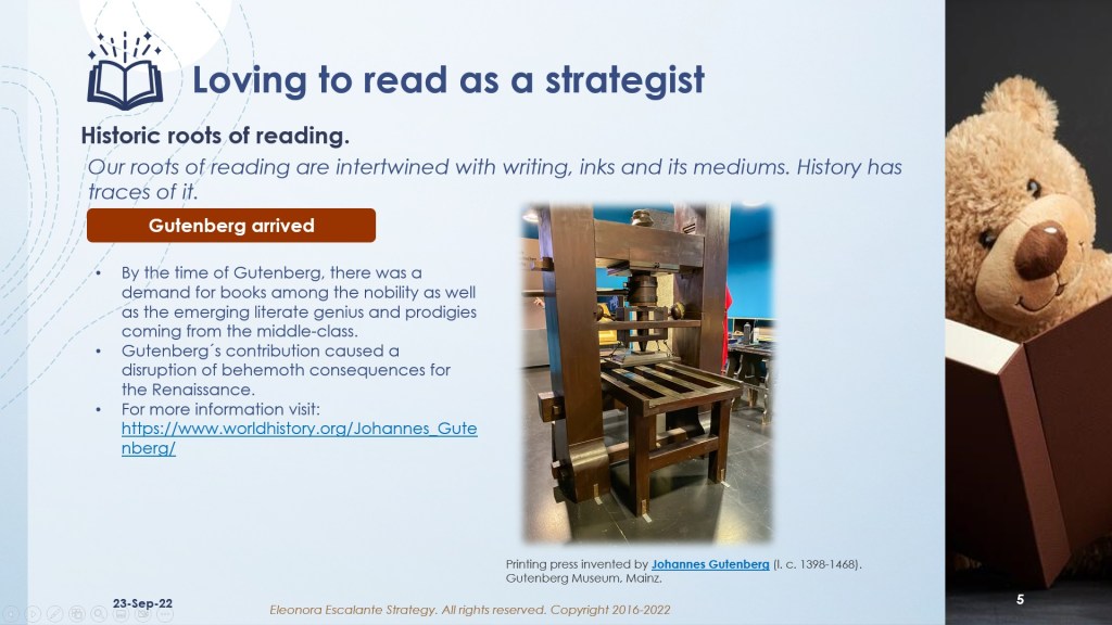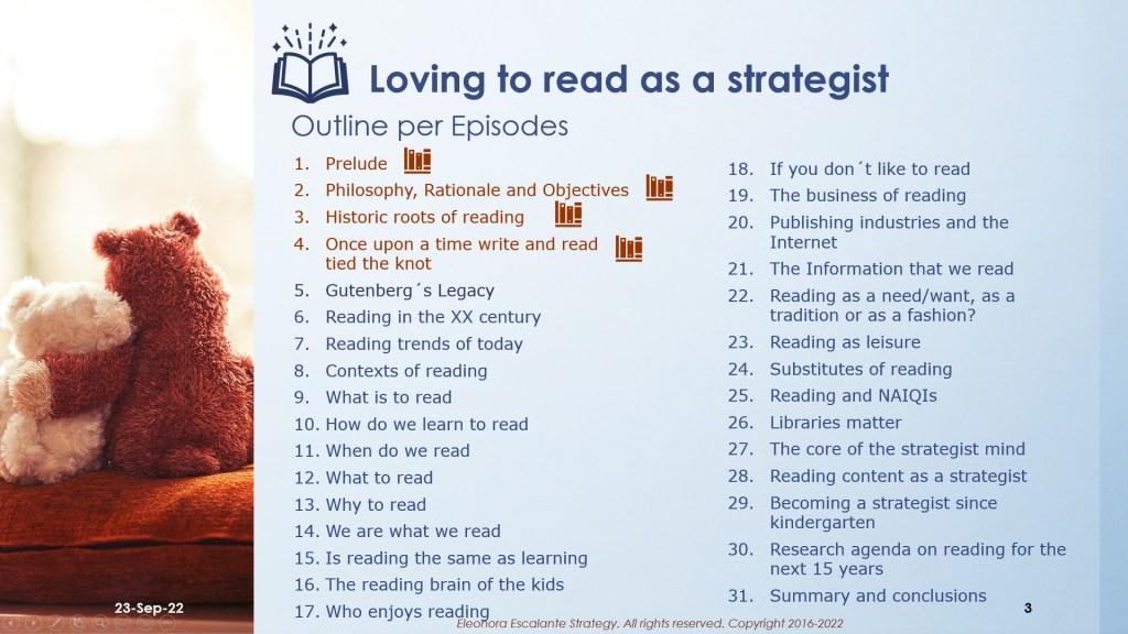 See you next Tuesday 27th of September, with the fifth chapter of the saga “Loving to read as a strategist: Gutenberg´s legacy”. Thank you for reading to me.