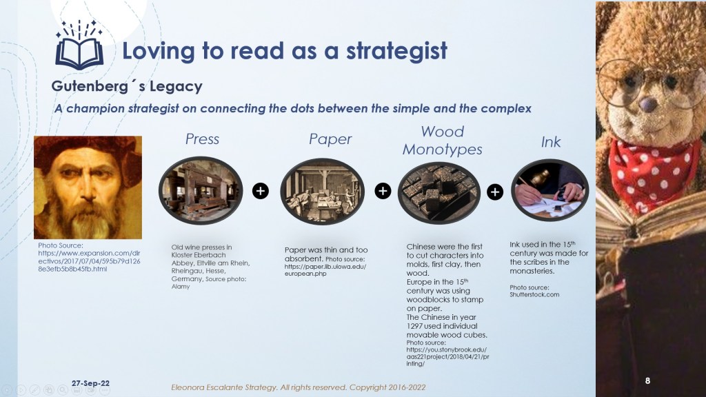 - Our third reflection is about Gutenberg´s mindset: He was a champion strategist on connecting the dots between the simple and the complex. See Slide number 8. Gutenberg had a unique strength, that didn’t happen automatically to anyone: he could connect his experience of metals, with the development of movable monotypes. On top of that he changed the 4 existing components of the printing press and adapted and/or modified them not once, but many times, using loops of trials until he could create a unique machine that produced the first printed Bible on earth.