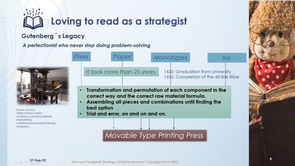 - The fourth reflection about Gutenberg´s corporate strategy: He was a perfectionist who never stopped performing problem-solving. See slide 9. This man solved all the hardships and difficulties of assembling the grape press, the ink, the paper, and the metal monotypes until he got an A+. He did not change the people´s habits; he changed the instruments of his press toolkit. He was not deliberately imposing his first idea, but after thousands of failed intents, he got it well… Time has proven to this day, that no one in history has gotten mental addictions or has been sick from reading good books or from becoming a bookworm.