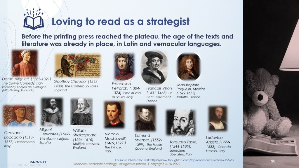 Please see the following set of slides. I have promised to offer Bonus material about the following subjects, and today we have included the Renaissance brief about the context of reading and writing between the XIII to XVII centuries.
