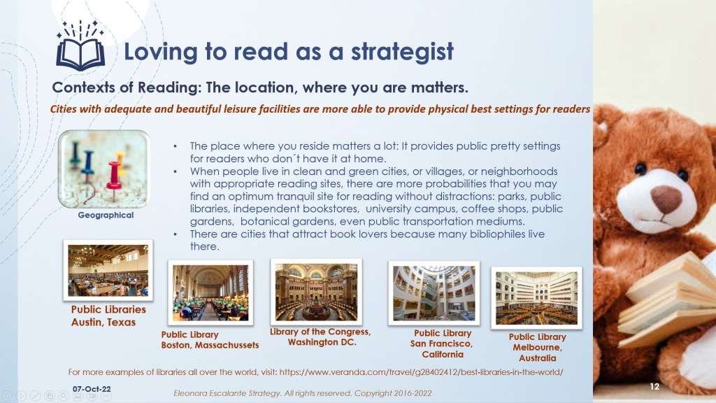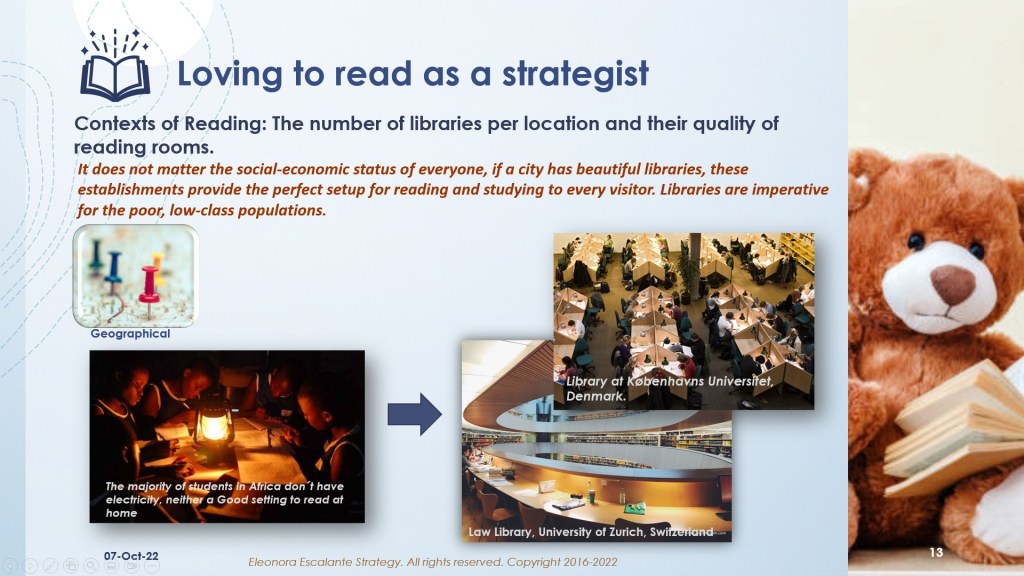 For some academics, the context is a setting or a background that affects the situation or an event. In the case of reading, our definition of the word context is a bit improved. For Eleonora Escalante Strategy, the context of your reading action (reading books) is an integrated milieu of multidimensional sub-contexts which influence or alter (for good or for bad) the action of reading strategically.