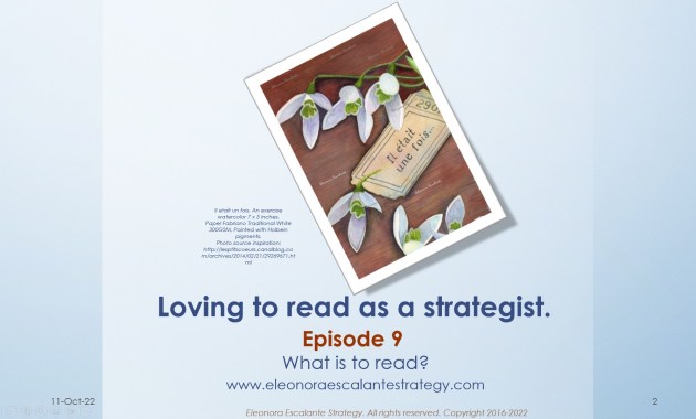 “Loving to read as a strategist”. Episode 9. What is to read. Today´s composition is about how to define reading, from the point of view of a corporate strategist. Let´s start. Popular definitions of reading.From the Merriam-Webster dictionary, to read means to […] eleonoraescalantestrategy 11 Oct 2022 Leave a Comment