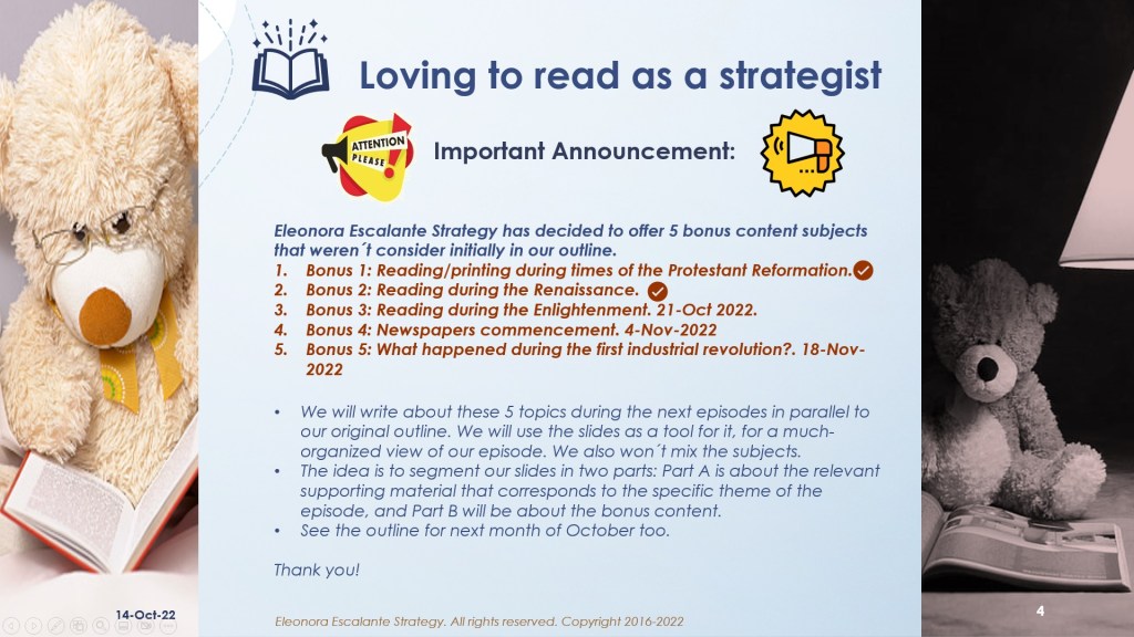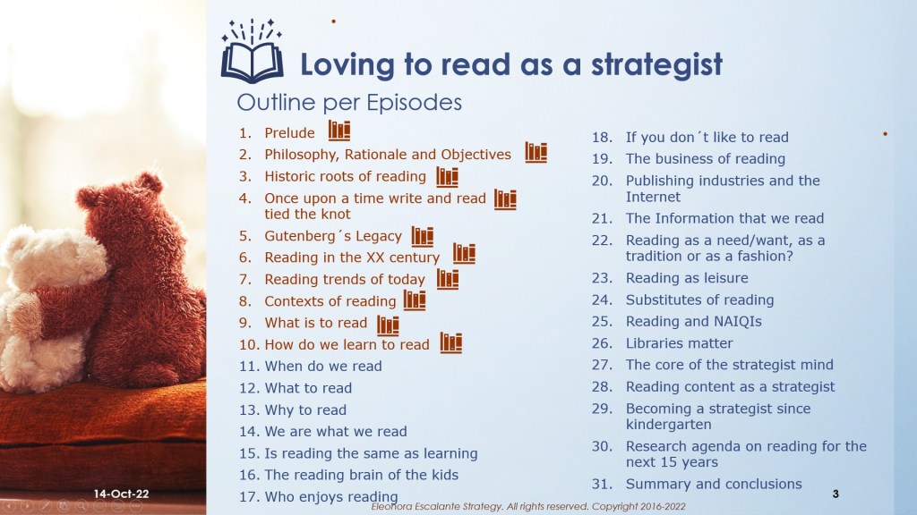 See you next Tuesday 18th of October, with the eleventh episode of the saga “Loving to read as a strategist: When do we read”. Thank you for reading to me. Have a pretty weekend.