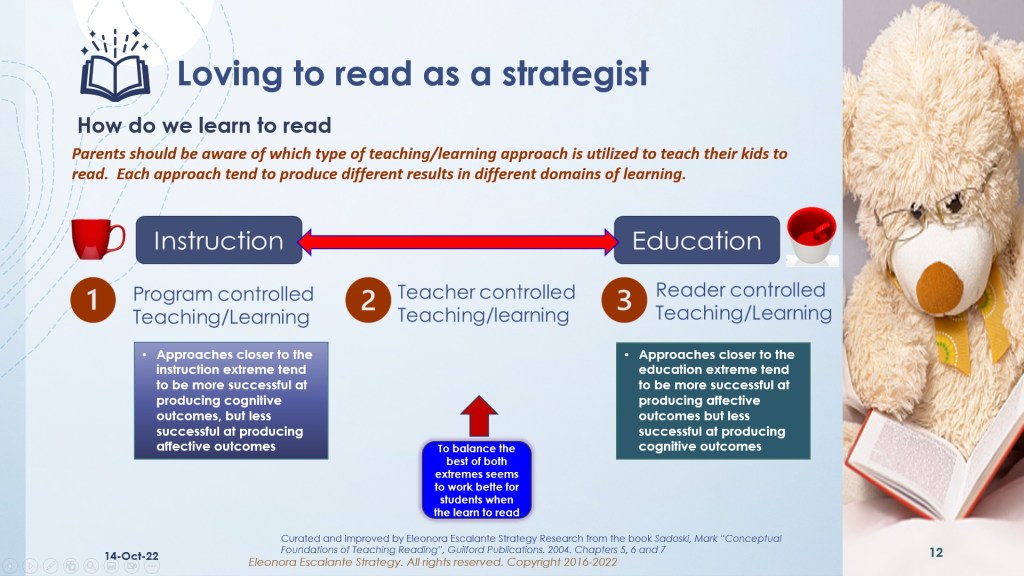 Mark Sadoski, the author of the book “Conceptual foundations of teaching reading” has generated an interesting framework for understanding the different approaches to teaching/learning reading. He has categorized a continuum for teaching to read between two opposite ends: Instruction (at your left) and Education (at your right). See slide number 7. All of us have been faced to learn how to read not exactly in those two extremes, but at some point, in the middle of both spectrums. Instruction for this author means to build or arrange from outside (what the teacher has) and show or tell or demonstrate or arrange lessons to the pupil or reading student. The knowledge is held by the teacher, meanwhile, the learners, who lack it, are receivers of the knowledge. On the other side Education, is to draw out, or to pull learning out from within the students. The learners have a more dominant role and the teacher’s role is to prompt, guide, and monitor what the student wants or needs to develop from within.