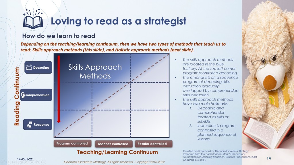 If you continue reading our slides, from slide number 13 to 17, Sadoski has offered two big groups of teaching/learning approaches. The ones that are near the spectrum of instruction, where the program is dominant over the teacher and the learner, and the second group that is near the spectrum of education, where the reader or learner is dominant over the teacher and the program. The first group approaches methods are called skills approach methods of reading, and the second is called holistic approaches methods of reading.