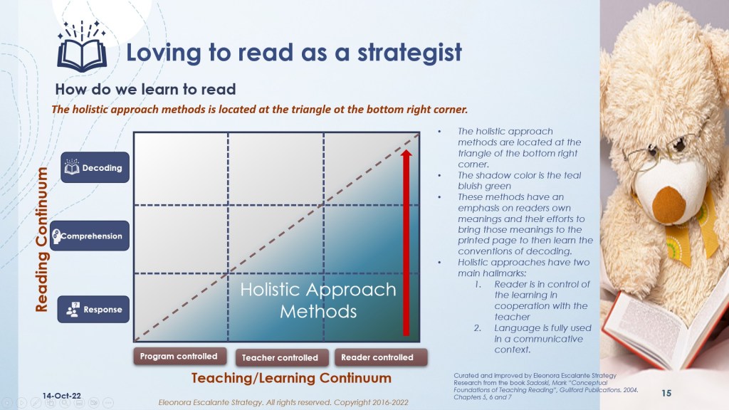 This matrix has 9 cells, and a diagonal line that divides both regions. You can see in your vertical axis, the three fundamental competencies of reading: decoding-comprehension-response. And in your horizontal axis, the three fundamental teaching/learning approaches are program, teacher, and reader. Slide number 14 shows the triangle’s location shadowed with the color blue, which corresponds to the Skills approach methods. Slide number 15 shows the triangle’s location shadowed with the color teal, which corresponds to the Holistic approach methods. The diagonal only helps us to distinguish both zones.