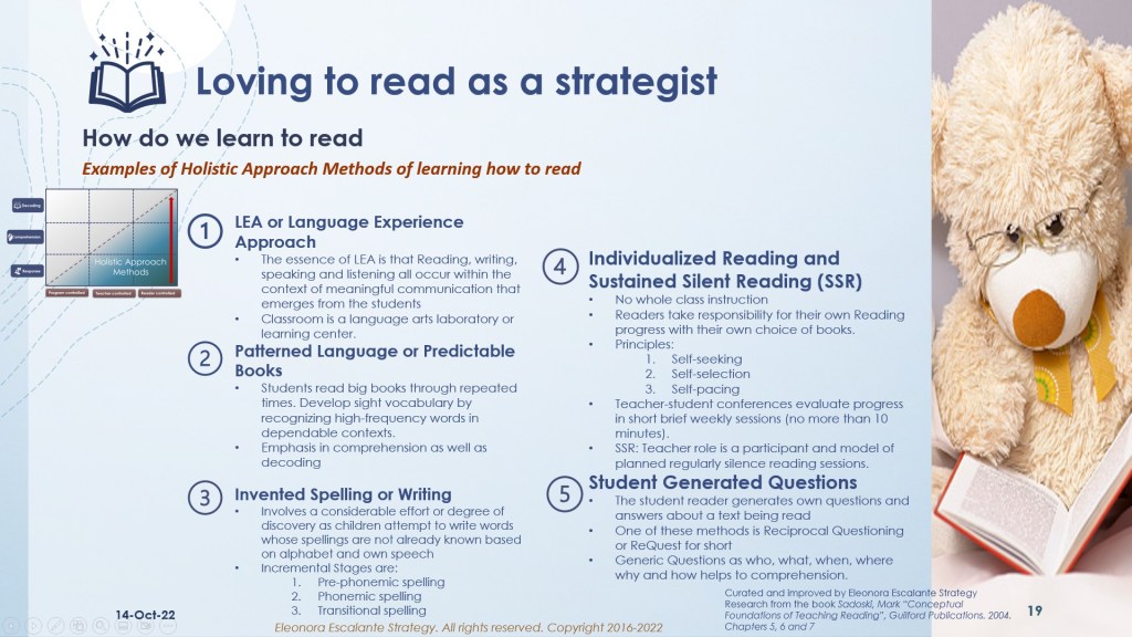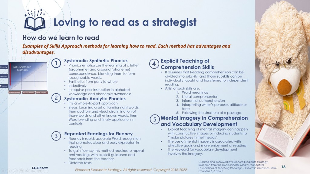 Each reading teacher should be knowledgeable about all the reading approaches (skills methods, holistic methods, and balanced methods). Only by learning all these methods, and applying them, investigating how they work in their teaching experiences, finding out what occurs with the reader after high school, researching the true causes of lack of literacy beyond K-12 per community, and installing different streams of literacy practice, we will be able to continue reading. It can´t be possible that only 1% of adults, globally, have disembarked to develop their brains to Level 5 of Literacy. We can ignite again our desire to read, to help the kids to also read again.