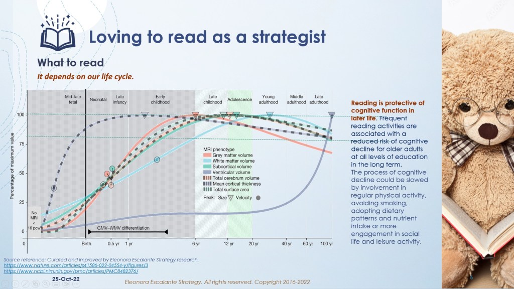 I have reposted slide number 6. According to a recent academic paper, accepted and published by the National Library of Medicine (4), and after 14 years of studies: “Reading is protective of cognitive function in later life. Frequent reading activities are associated with a reduced risk of cognitive decline for older adults at all levels of education in the long term”. We already know that the process of cognitive decline could be slowed by involvement in regular physical activity, avoiding smoking, adopting dietary patterns and nutrient intake, and/or more engagement in social life and leisure activity. Well, reading skillfully and constantly is directly associated with our mental health. So, what we mean to read is long texts. We are not talking about short stories or little essays or publications of less than 3,000 words (as this one). We are ushered to read books above 100,000 words (5). On average, “novels are around 90,000 words long. One book page generally contains 250-300 words, so a 90,000-word book represents a book of 320 pages” (6).
