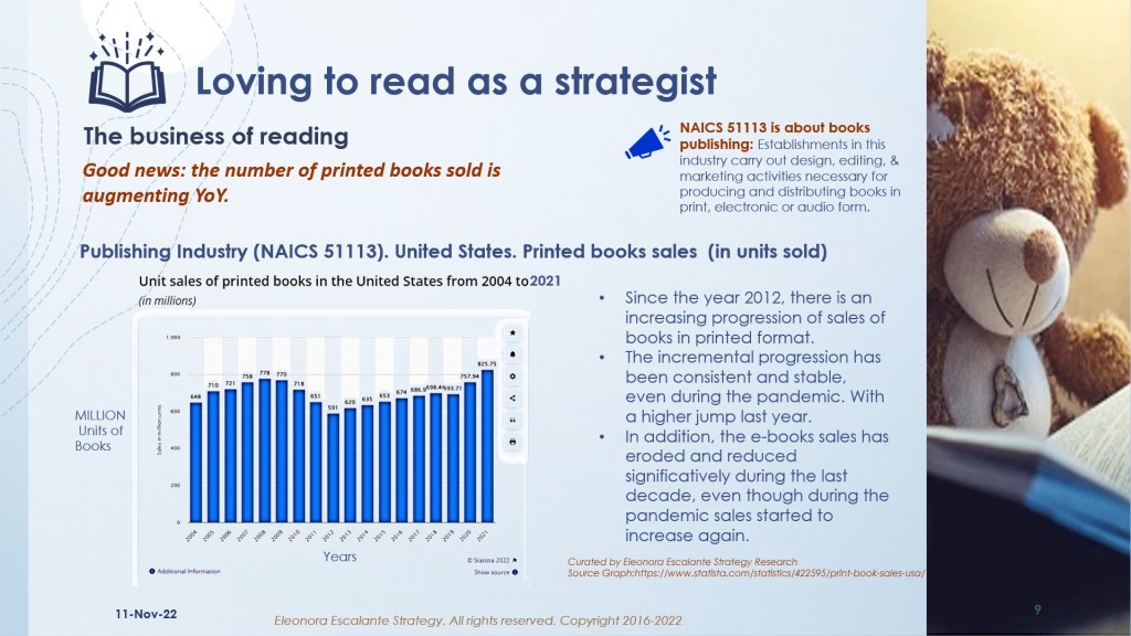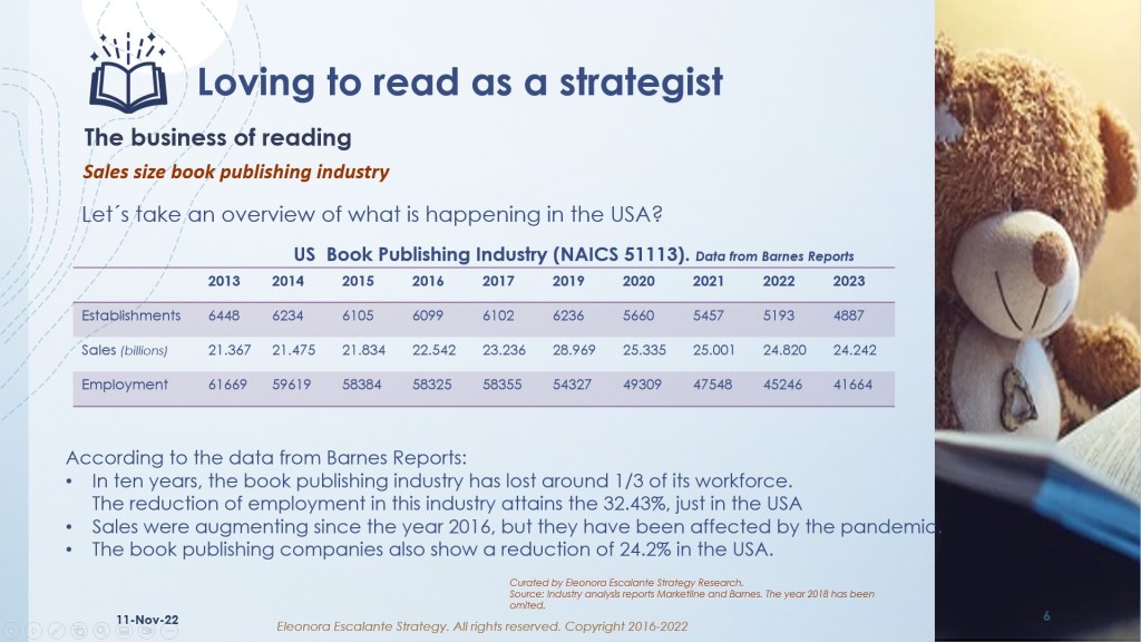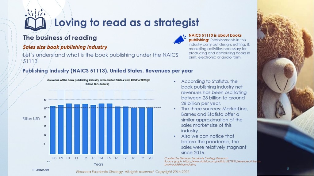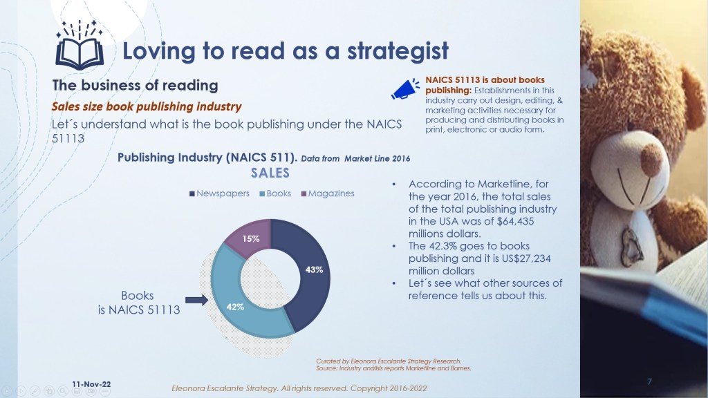 Let´s find out what is the business of reading. We have prepared a set of slides about the book publishing industry which is represented in the NAICS 51113 (By the US NAICS 2017 categorization).