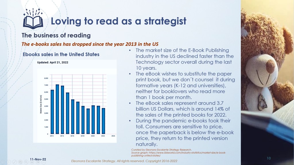 If the business of reading is the foundation of all our learning experiences in all disciplines, how did we jump into using multimedia and the internet, then, without knowing in advance all the consequences? What drivers were considered at that time to promote such a dramatic change that we are reaping the imbalance of such decisions today… In my personal opinion, not as a strategist, but as a book-lover ultimate consumer: we are reaping now all the consequences of the decisions taken in the 1990s decade. More than 25 years have passed. And we are just starting to wake up to the notion that it is not the tech that drives business, but it is business that must rely upon independent researchers (from multiple academic sources with impeccable ethics) first. It is the business that must depend on a diversity of professions and domains (including historians, social scientists, archaeologists, human resources specialists, historians of the art, psychologists, philosophers, human scientists, neurophysiologists, brain connoisseurs, etc) to evaluate with serious long studies to all the innovation technologies first, before even considering them commercially viable for a Design-based research process.