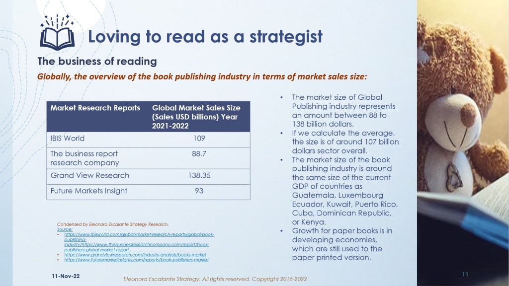 I exhort you to understand the slides that we have prepared for you. I have been trying to understand the size of the publishing industry first, not just in the United States, but also globally. I also wish you to see the big picture: The market size of book publishers is around 100 billion dollars per year globally. 25 companies represent 50% of that global market in sales. The top book publisher corporations are RELX, Pearson, Thompson Reuters, Bertelsmann, Wolters Kluver, Hachette Livre, Springer, Wiley, Haper Collins, Scholastic, McGraw Hill, Phoenix Publishing, Cengage, and Holtzbrink. The first inference about the reading book business industry (we have not included magazines and newspapers in our analysis), is that the book-publishing industry is highly concentrated. In addition, the publishers of higher reputation are located in the USA, The Netherlands, Italy, Germany, France, Canada, Spain, the UK, and Japan. The second inference is that all our reading books are published in 9 countries, from which all our learning depends. In our schools (K-12) and Universities, we learn from books published in these nations.